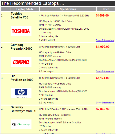 A list of three recommended laptops with their specification and price is presented as a DSS output, which is ordered by the greatest match to the interpreted needs of the user (obtained from the input page). Hyperlinks to the manufacture webpage of each particular model are available for users to find more about laptop features, laptop apperance and detailed technical information and how to purchase.